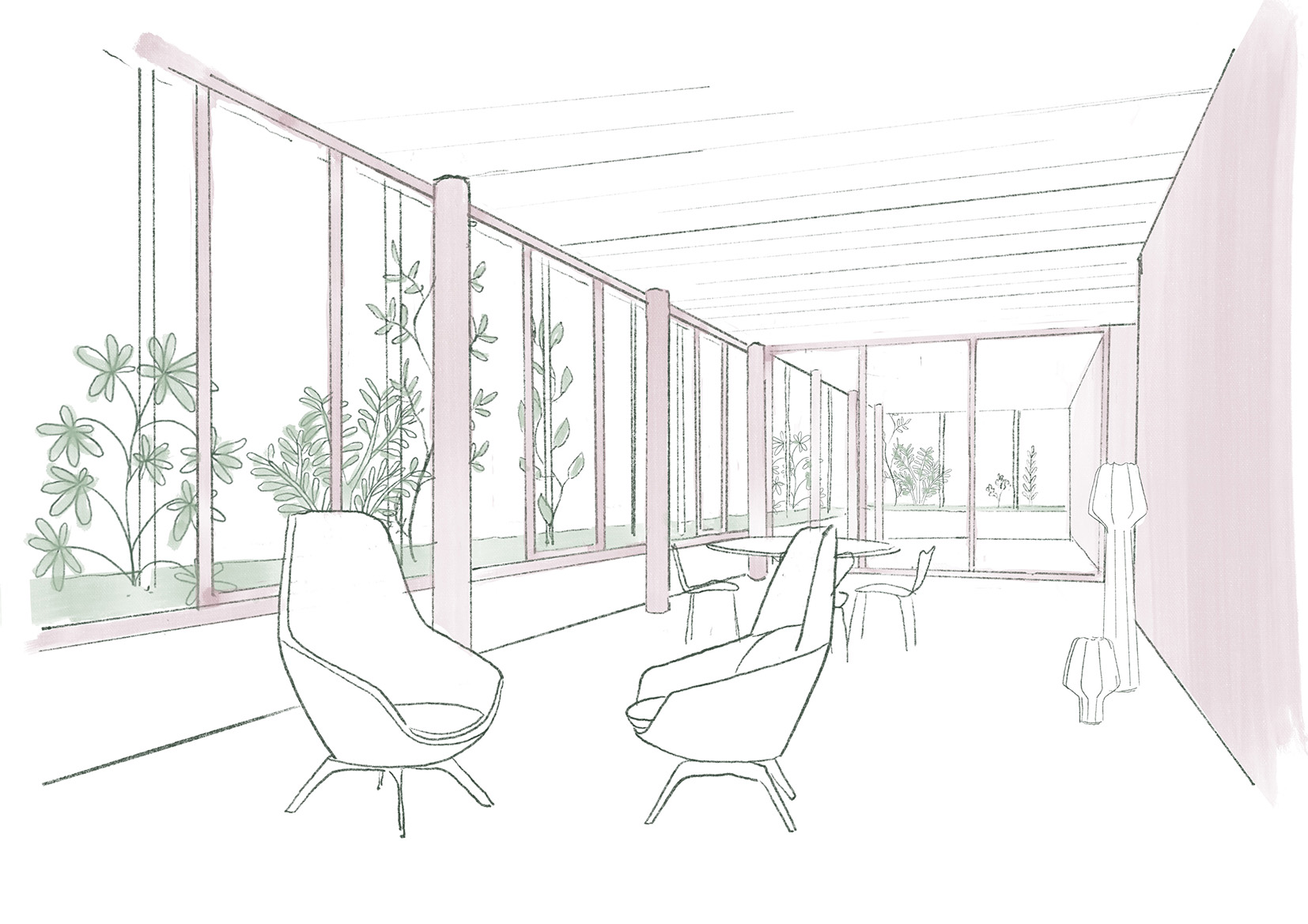 Die Laubenhalle wird zum gemeinschaftlichen Ort mit Zugang zum Garten und Erschliessung der Wohnungen über drei Treppen. Der Eingang zur Pfister-Holding liegt an der Tramstrasse: eine eigenes Foyer mit kleiner Ausstellung und Lift bildet eine klare, eigenständige Adresse.