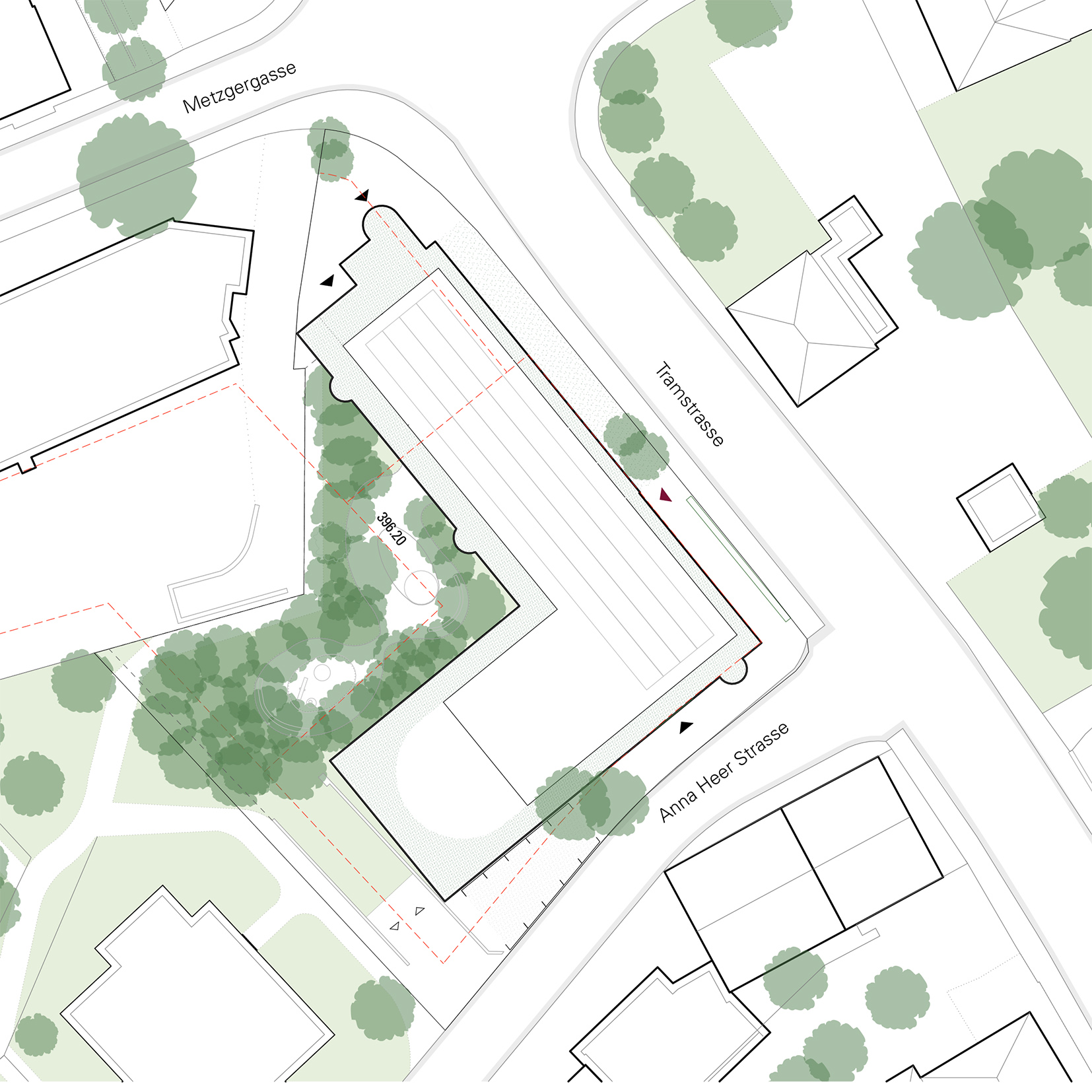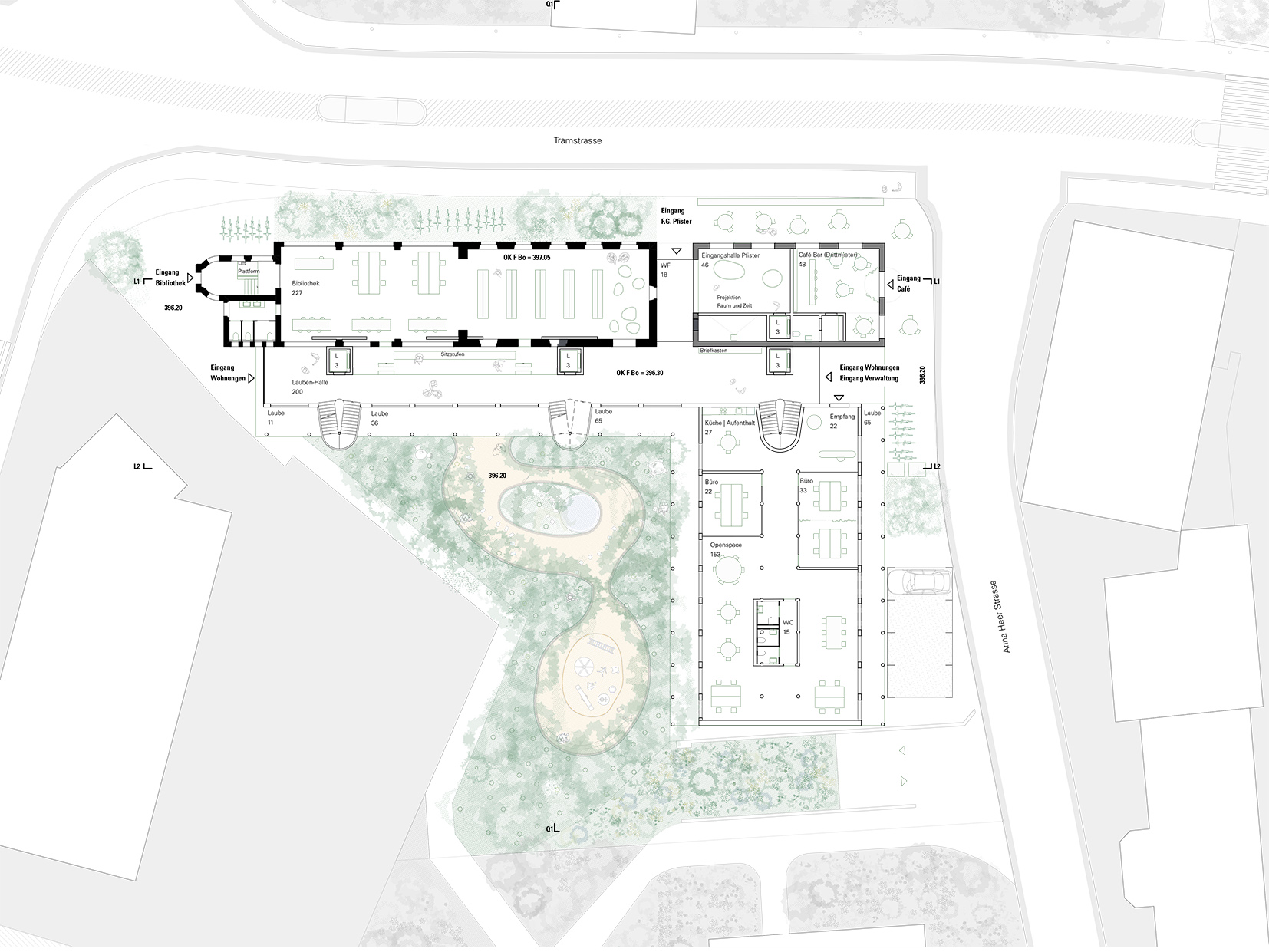 Eine zentrale Präzisierung ist die entspannte Trennung der Zugänge. Die Bibliothek im bestehenden Atelierhaus bietet eine reiche Erlebniswelt und kann sich in die Laube öffnen. Das Café an der östlichen Ecke belebt mit seiner Aussenbestuhlung den Strassenraum, während die Gemeinderäume im hölzernen Gartenhaus direkt zugänglich sind. Parkplätze und Velostellplätze entlang der Anna-Heer-Strasse ergänzen das Angebot.