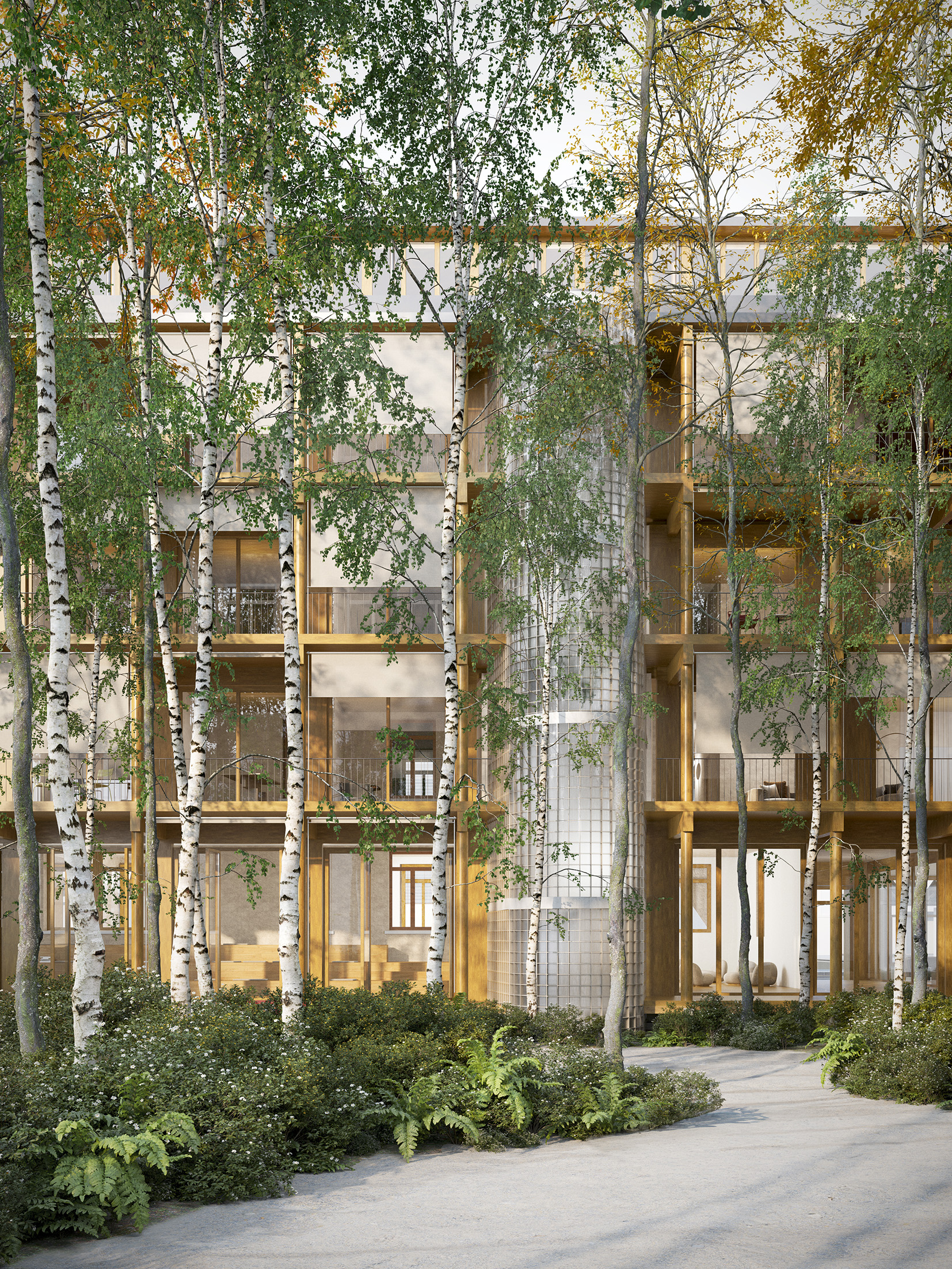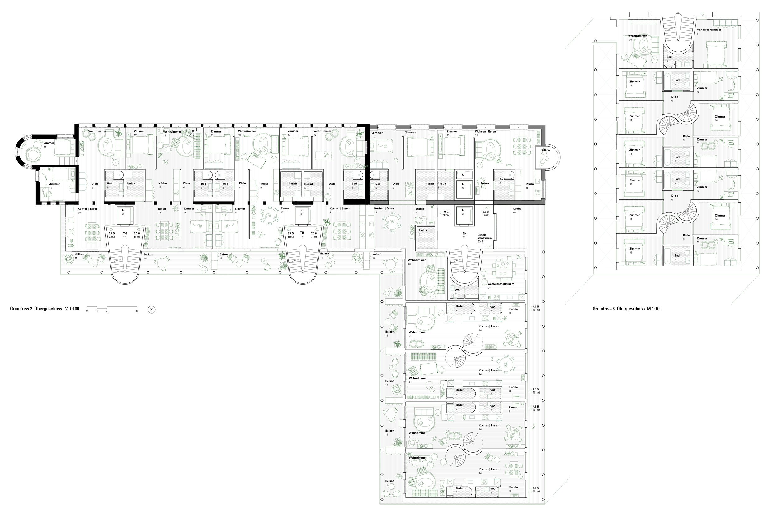 Die 22 Wohnungen werden über drei Treppen aus der erdgeschossigen Laubenhalle erschlossen. Entlang der Tramstrasse liegen 2- und 3-Spänner, im Osten vier Maisonettewohnungen, deren Aufbau als „Town Houses“ besonders familiengerecht ist. Alle Wohnungen sind mindestens zweiseitig, teils dreiseitig orientiert. Unterschiedliche Grössen und Typen fördern eine lebendige Durchmischung und nachhaltige Nachbarschaften. Gemeinschaftsräume am Laubengang ergänzen das Angebot.