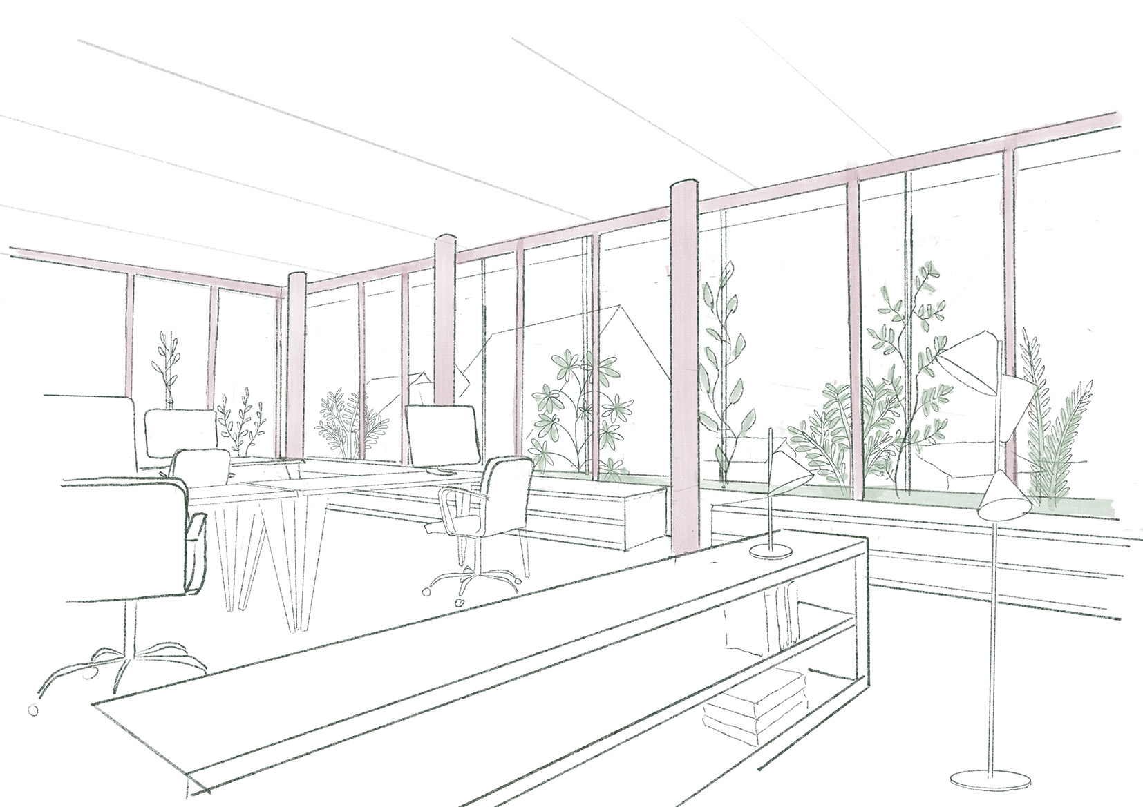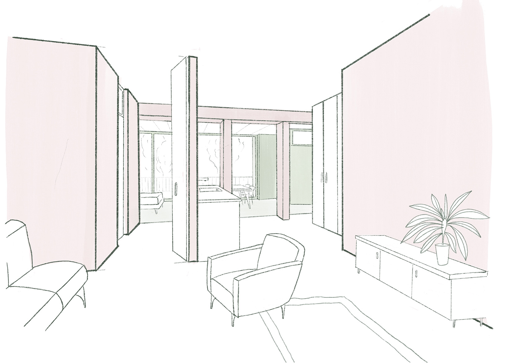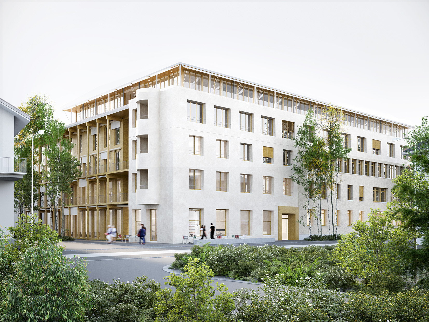 Ausgangspunkt ist das bestehende Atelierhaus, dessen Substanz wir sorgfältig weiterbauen. Der neue, verputzte Baukörper aus Hanfsteinen entlang der Strasse trägt die Idee des verputzten Hauses in ortsbaulicher Kontinuität weiter, während sich die Gartenseite leicht und hölzern zeigt. Feine Holzbalkone und Laubengänge schaffen eine warme Atmosphäre zum begrünten Hofgarten. So entsteht ein stimmiges Ensemble, das in grosser Gelassenheit an die Geschichte von Möbel Pfister in Suhr anknüpft.