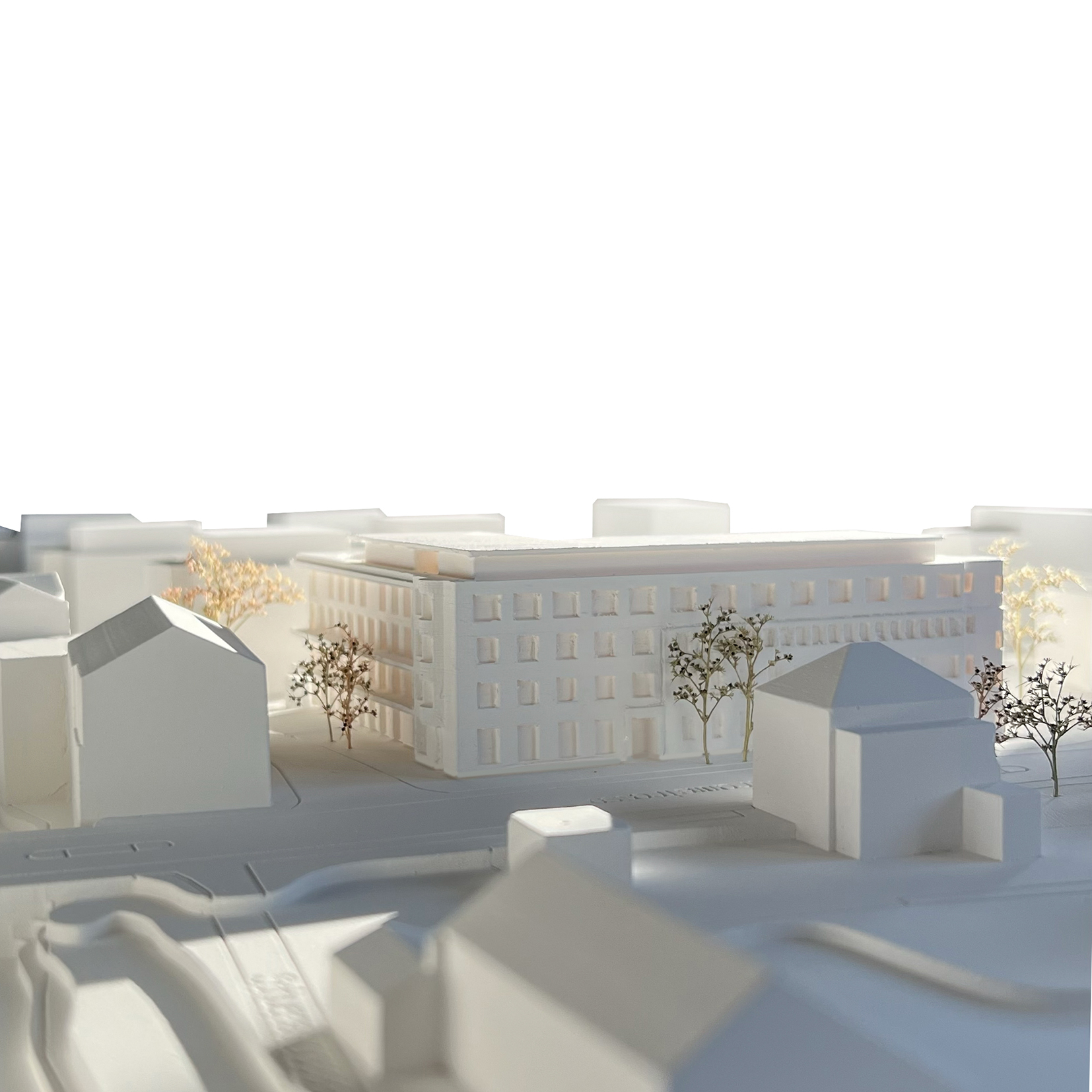 Das Haus ist eng mit dem Ort und seinem vielfältigen Leben verbunden. Entsprechend ist das Erdgeschoss mit unterschiedlichen Nutzungen programmiert, die nach aussen wirken und den öffentlichen Raum beleben. Bibliothek, Café, Gemeinderäume und Wohnungen ergänzen sich zu einem lebendigen Ganzen. Durch die sorgfältig platzierten Eingänge wird die Tramstrasse aufgewertet und klar strukturiert.
